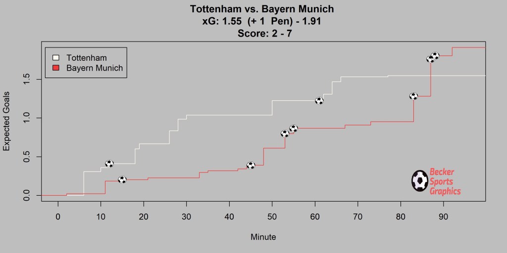A look at the running xG plot for the game might look surprising for anyone who didn’t watch the game. It wouldn’t be a stretch to say Bayern were fortunate to not be behind at halftime, let alone up 2-1. Heung-Min Son in particularly was a constant threat for Spurs early on. So where and how did it go so wrong?