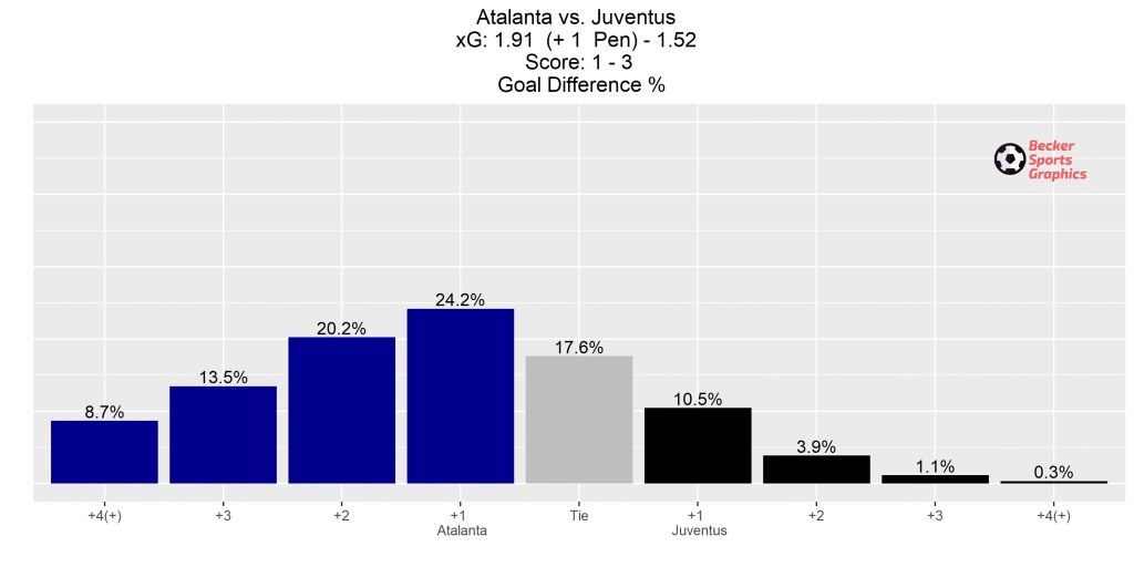 The Win Percentage plot below shows that 2/3 of our 10,000 simulations of today’s shots had Atalanta winning, which would have taken them above Cagliari and Lazio and into 3rd place.