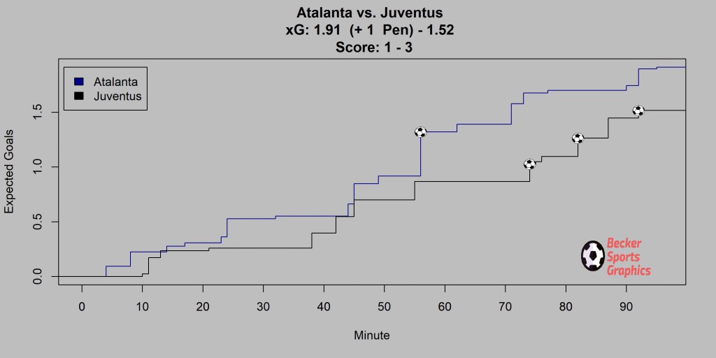 Atalanta missed a penalty in the first half but still had the lead going into the final 20 minutes. That was when Gonzalo Higuain struck twice and then Paulo Dybala finished the game as a contest in injury time. This was not the result of dominant pressure finally telling, as we can see from the Running xG plot below. Atalanta had almost as much xG as Juventus after it went 1-0, but Juventus made their chances count.