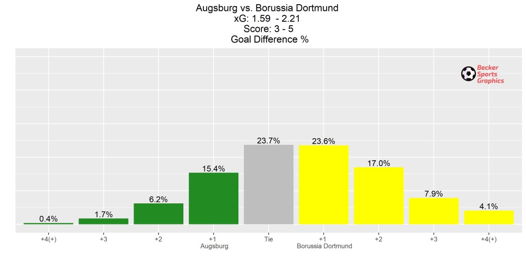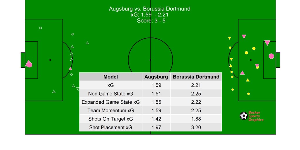 A look at the shot map for Borussia Dortmund’s 5-3 win over Augsburg suggests a wild game, but one which ultimately ended with the correct result. Augsburg created and scored two great chances but, those aside, BvB dominated and were worthy winners.